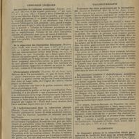 0141 - Page 133 - Analyses et indications bibliographiques. Orthopédie. Chirurgie infantile ; par M. Lance... Rachis. Les fractures du rachis. (S. Kleinberg. Journ. of bone and Joint Surgery...) / Le traitement opératoire de la scoliose. (A. Mackenzie Forbes...) / Les opérations ankylosantes dans le traitement du mal Pott chez l'adulte. IVe Réunion annuelle de la Société française d'orthopédie,... (E. Estor... Voir Analyse in Gaz. des hôpit.) / Quelques considérations sur l'ostéosynthèse dans le mal de Pott. (J. Calvé et M. Galland... Journ. de chir...) / Hypertrophie osseuse dans le mal de Pott. (R. B. Cofield. Journ. of bone and Joint Surgery...)