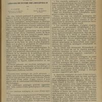 0020 - Page 10 - Sociétés savantes. Société de pédiatrie. (Séance du 19 décembre 1922). L'homalopsie exophtalmique, dystrophie cranienne congénitale. M. G. Blechhann / Remarques à propos d'un centre d'élevage. M. Blechmann / L'otite des nourrissons, en particulier des athrepsiques. M. Abrand / Résultat éloigné d'une anastomose tendineuse pour paralysie infantile. M. P. Hallopeau / Atrophie musculaire progressive. MM. Babonneix et Lance / Etat tétaniforme généralisé permanent chez un nouvaeu-né, consécutif à une vaccination ulcéreuse. MM. G. Salès et Pierre Vallery-Radot / De la valeur séméiologique de certaines hydrocèles vaginales persistantes chez le nouveau-né au point de vue du diagnostic de la syphilis héréditaire. MM. G. Salès et Pierre Vallery-Radot / Endocardite mitrale rhumatismale à évolution et à symptomatologie particulières. MM. Babonneix et Peignaux / Un cas de paralysie infantile, avec lésion probable de la substance blanche de la moelle épinière. MM. Nobécourt et René Mathieu / Rapport entre le zona et la varicelle. M. Jean Hallé / Hémorragie cérébrale chez un enfant de huit ans et demi. M. Jules Renault, au nom de M. Reuilly / Hémorragie cérébrale chez un enfant de trois ans. M. Jules Renault et Mlle Labaume