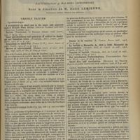 1513 - Page 1527 - Analyses et indications bibliographiques. Pathologie générale. Bactériologie & maladies infectieuses. Sous la direction de M. André Lemierre... Fièvres typhoïdes et paratyphoïdes. Two food poisoning outbreak due to bacille of Paratyphoid group. (E. O. Jordan et J. C. Geriger. Journ. of infections dis...). [J. Paraf] / Dysenterie - choléra. Separation of the toxin of B. dysenterie shuga. (M. Cartney et Olitski. Journ. of exp. medecine...) / De la pathogénie du choléra. L'algidité cholérique. (G. Sanarelli. Ann. Institut Pasteur...). [J. Paraf] / Méningocoque. Contribution à la clinique et au traitement de la méningite cérébro-spinale épidémique chez l'enfant. (Samet Madels. Arch. méd. des enf...). [J. Paraf] / Intraventricular serum treatment of the epidemic meningites. (Howel et Cohen. Journ. of amer. med. Assoc...). [J. Paraf] / Uber Meningokoken typen in Strasburg. (Hundeshagen. Deutsch. med. Woch...). [J. Paraf] / Studies on the virulence of meningococcus. (Herst, Salomon Solis Cohen et Meyer Solis Cohen. Journ. of immunilogy...). [J. Paraf] / Gonocoque. A serological study of the gonococcus group. (Torrey and Buckel. Journ of immunol...). [J. Paraf]