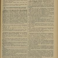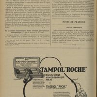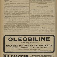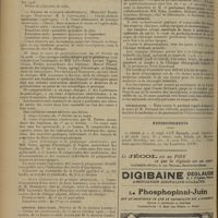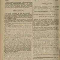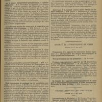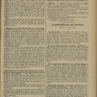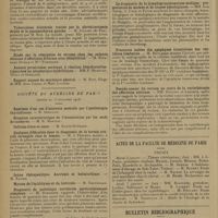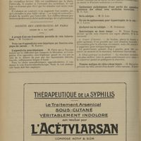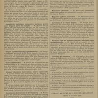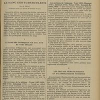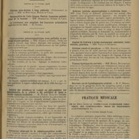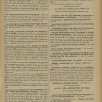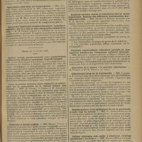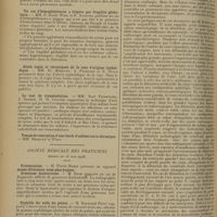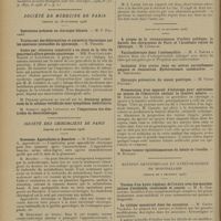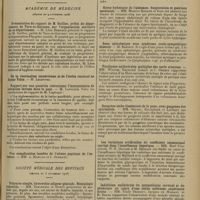 0131 - Page 123 - Sociétés savantes. Société médicale des hôpitaux. (Séance du 8 janvier 1926). Le somnifène dans l'état de mal épileptique. MM. Rimbaud, Boulet et Chardonneau... / Septicémie à anaérobies non encore décrits. MM. Vaucher, Boez, Landzenberg et Mme Kehlstadt / A propos de l'exploration duodénovésiculaire : la cholécystographie « per os » avec ou sans radiographie duodénale en série. M. M. Chiray / (Séance du 15 janvier 1926). Syphilis spinale pseudo-tumorale avec xanthochromie ou dissociation albumino-cytologique. Contrôle lipiodolé. MM. Sicard, Hagueneau et Lichtwitz / Action de certains excitants neuro-végétatifs et endocriniens sur la contractilité de la vésicule biliaire chez l'homme. MM. M. Chiray, J. Lebon et M. Callegeri / Axiphoïdie et hérédo-syphilis. MM. Sézary, Vibert et Godel / Sur un cas de grande hémophilie au cours d'une ictère lithiasique infecté. Transfusions, opération, guérison de l'hémophilie. MM. P. Emile-Weil et Stieffel / Accidents nerveux, osseux et articulaires chez un ancien syphilitique. Relation des différentes manifestations morbides entre elles. MM. Bariéty et Kaplan (présentés par M. A. Lafitte) / Paralysie amyotrophique radiculaire partielle du type supérieur lombaire par rhumatisme vertébral chronique. MM. Raynaud, Lacroix, Boutin et Marill / Réflexions sur deux cas de dextrocardie. MM. A. Clerc et R. Lévy / Manifestations à forme épidémique de cas de pneumonie franche chez les enfants. MM. P. Armand-Delille et Vanbockshael / Scoliose alternante avec rachis à ressort par vertèbres cunéiformes « en tiroir ». MM. Maurice Mayer et Claude Testu