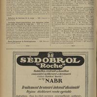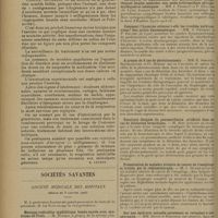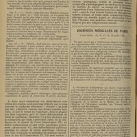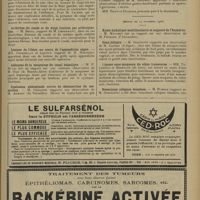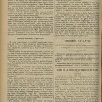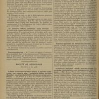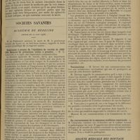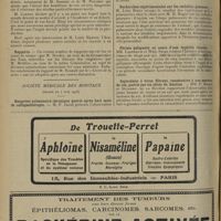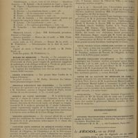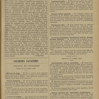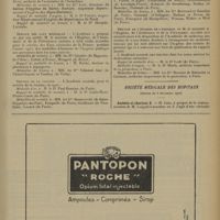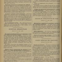 0036 - Page 28 - Sociétés savantes. Société de chirurgie. (Séance du 25 novembre 1925). Héliothérapie. M. Mouchet, à propos de la communication faite dans la dernière séance par MM. Duguet et Clavelin / Appendicite, septicémie consécutive, accidents graves ayant disparu après une saignée. M. Michon, sur une observation adressée par M. Aumont... / Origine appendiculaire de la périduodénite. M. Basset', un travail de M. Hertz / Gastro-jéjunostomie. M. Proust, sur une communication de M. Lauwers / Estomac biloculaire, intervention, ulcères consécutifs. M. Cunéo, une observation de M. Pauchet / Sacralisation douloureuse de la Ve lombaire. M. Basset / (Séance du 2 décembre 1925). Fractures complexes. M. Louis Bazy / Accès sur le rein par voie thoraco-abdominale. M. Legueu, en son nom et au nom de M. Fey / Anévrisme de la région fessière. M. Moure, sur une observation de M. Charbonnel... / Pouls lent chez des malades atteintes d'affections aiguës intra-abdominales. M. Sauvé, sur cinq observations adressées par MM. Jeanneney et Piéchaud... / Luxations du métatarse. M. Kuss, deux observations de MM. Cochez et Pierry... / Comité médical des Bouches-du-Rhône. (Séance de novembre 1925). Volumineux épithéliomas métastatiques des capsules surrénales sans pigmentation cutanéo-muqueuse. MM. Boinet, Rouslacroix et Jean Piéri