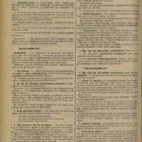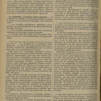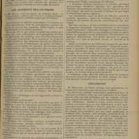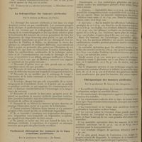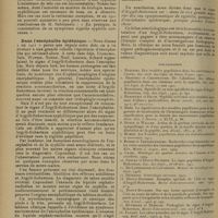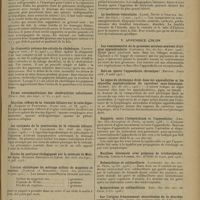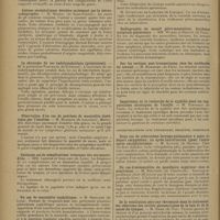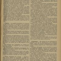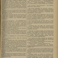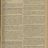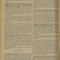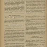 1589 - Page 1581 - Analyses et indications bibliographiques. Oto-rhino-laryngologie ; par M. Paul Truffert... Larynx. Trois observations de sympathicectomie péri-artérielle pour ulcération torpide du larynx. Résultats immédiats et éloignés. (M. Jacod. Ann. des mal. de l'oreille...) / Contribution à l'étude des spasmes glottiques. (J. Cisler. Arch. intern. de laryngol.,...) / Deux cas de paralysies laryngées associées complexes, consécutives à des blessures par balles. (Spick et Virlière. Arch. intern. de laryngol.,...) / A propos d'un cas de tolérance bronchique pour un corps étranger. (Prof. Jacques. Oto-rhino-laryngol. intern.,...) / Exploration iodée des bronches par le cathétérisme du larynx. (O. Beck. Ann. des mal. de l'oreille...) / Bouches et pharynx. De l'utilité de l'amygdalectomie totale. Sa technique. (J. Orgogozo. Revue de laryngol. et d'otol.,...) / Phlegmon péri-amygdalien hémorragique ; ligature de la carotide externe ; mort par septicémie quarante-huit heures après. (Valmat. Revue de laryngol. et d'otol.,...) / Tumeur angiomateuse vélopalatine. Diathermie. Guérison. (J. Magnan. Revue de laryngol. et d'otol.,...) / Réfection de division totale du voile du palais, en utilisant les amygdales palatines dans les cas considérés comme inopérables, conséquences fonctionnelles de la méthode. (J. Eastman Sheehan. Arch. intern. de laryngol.,...)