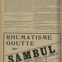 0036 - Page 28 - Sociétés savantes. Société de chirurgie. (Séance du 25 novembre 1925). Héliothérapie. M. Mouchet, à propos de la communication faite dans la dernière séance par MM. Duguet et Clavelin / Appendicite, septicémie consécutive, accidents graves ayant disparu après une saignée. M. Michon, sur une observation adressée par M. Aumont... / Origine appendiculaire de la périduodénite. M. Basset', un travail de M. Hertz / Gastro-jéjunostomie. M. Proust, sur une communication de M. Lauwers / Estomac biloculaire, intervention, ulcères consécutifs. M. Cunéo, une observation de M. Pauchet / Sacralisation douloureuse de la Ve lombaire. M. Basset / (Séance du 2 décembre 1925). Fractures complexes. M. Louis Bazy / Accès sur le rein par voie thoraco-abdominale. M. Legueu, en son nom et au nom de M. Fey / Anévrisme de la région fessière. M. Moure, sur une observation de M. Charbonnel... / Pouls lent chez des malades atteintes d'affections aiguës intra-abdominales. M. Sauvé, sur cinq observations adressées par MM. Jeanneney et Piéchaud... / Luxations du métatarse. M. Kuss, deux observations de MM. Cochez et Pierry... / Comité médical des Bouches-du-Rhône. (Séance de novembre 1925). Volumineux épithéliomas métastatiques des capsules surrénales sans pigmentation cutanéo-muqueuse. MM. Boinet, Rouslacroix et Jean Piéri0036 - Page 28 - Sociétés savantes. Société de chirurgie. (Séance du 25 novembre 1925). Héliothérapie. M. Mouchet, à propos de la communication faite dans la dernière séance par MM. Duguet et Clavelin / Appendicite, septicémie consécutive, accidents graves ayant disparu après une saignée. M. Michon, sur une observation adressée par M. Aumont... / Origine appendiculaire de la périduodénite. M. Basset', un travail de M. Hertz / Gastro-jéjunostomie. M. Proust, sur une communication de M. Lauwers / Estomac biloculaire, intervention, ulcères consécutifs. M. Cunéo, une observation de M. Pauchet / Sacralisation douloureuse de la Ve lombaire. M. Basset / (Séance du 2 décembre 1925). Fractures complexes. M. Louis Bazy / Accès sur le rein par voie thoraco-abdominale. M. Legueu, en son nom et au nom de M. Fey / Anévrisme de la région fessière. M. Moure, sur une observation de M. Charbonnel... / Pouls lent chez des malades atteintes d'affections aiguës intra-abdominales. M. Sauvé, sur cinq observations adressées par MM. Jeanneney et Piéchaud... / Luxations du métatarse. M. Kuss, deux observations de MM. Cochez et Pierry... / Comité médical des Bouches-du-Rhône. (Séance de novembre 1925). Volumineux épithéliomas métastatiques des capsules surrénales sans pigmentation cutanéo-muqueuse. MM. Boinet, Rouslacroix et Jean Piéri