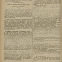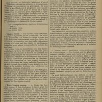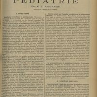 0097 - Page 89 - Analyses et indications bibliographiques. Pédiatrie sous la direction de M. L. Babonneix... II. Affections respiratoires. Kyste hydatique du poumon chez l'enfant. (L. Morquio. Conférence faite aux enfants-malades...). [L. Babonneix] / III. Affections circulatoires. L'hypertension artérielle infantile, stigmate d'hérédosyphilis. (J. Génévrier. Bull. méd...). [Maurice Lévy] / Une mesure prophylactique du choléra infantile. (Ribadeau-Dumas et Fouet. Semaine des hôpit. de Paris...). [Maurice Lévy] / IV. Maladies des nourrissons. Nouvelles recherches sur l'ictère simple du nouveau-né. (G. L. Hallez. Le nourrisson...). [Maurice Lévy] / Les accidents de la première dentition. (A.-B. Marfan. Le Nourrisson...). [Maurice Lévy] / La polydactylite hérédo-syphilitique du nourrisson. (Lereboullet, Saint-Girons et Gournay. Arch. méd. des enf...). [Maurice Lévy]