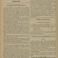 1585 - Page 1577 - Analyses et indications bibliographiques. Oto-rhino-laryngologie ; par M. Paul Truffert... Nez et cavités annexes. Diagnostic des sinusites frontales chroniques (refroidies). Trépanation du sinus frontal. (J. Mouret. Revue de laryngol.,...) / Oreilles. Paralysies du nerf facial « a frigore ». (A. Barraud. Ann. des mal. de l'oreille...) / Sur l'existence d'un point fréquemment douloureux de la pointe de l'apophyse mastoïde dans les suppurations aiguës de l'oreille moyenne. (P. Caliceti. Oto-rhino-laryngol. intern.,...) / Les divers temps de la mastoïdectomie. Mastoïdectomie maxima. [Vues en photographies stéréoscopiques.] (J. Mouret. Ann. des mal. de l'oreille...) / Le syndrome de Gradenigo. (Rimini. Arch. intern. de laryngol.,...) / Thrombophlébite otogène isolée du sinus caverneux. (M. Lannois et P.-L. Monnier. Ann. des mal. de l'oreille...) / Résultats éloignés du traitement chirurgical des abcès cérébraux et des méningites otogènes. (F. Ninger. Arch. intern. de laryngol.,...) / Sur les abcès cérébelleux muets. (C. Ferreri. Arch. intern. de laryngol.,...)