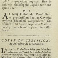 - Discours philosophiques sur les deux merveilles de l'art et de la nature. Ou traité de la liqueur de l'alchaest, & de la medecine universelle. De la matiere de l'une & de l'autre. Du moyen d'operer. Et de la voye qu'il faut tenir pour faire le sel de tartre volatil. Composez en latin, par Monsieur Des Comtes, philosophe & medecin. Et mis en françois, par Robert Preud'homme, ancien maistre ecrivain juré à Paris. Seconde edition, reveuë et corrigée.