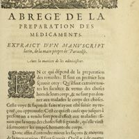 0196 - Page sans numérotation - Abregé de la preparation des medicaments. Extraict d'un manuscript latin, de la main propre de Paracelse. Avec la manière de les administrer