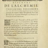 0216 - Page 1 - Discours de l'alchimie, troisiesme fondement de la medecine paracelsique ; extraict des oeuvres dudit Theophraste Paracelse Bombast