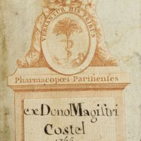 - Ex-dono "Magistri Costel 1765" au contre-plat supérieur. "Ex-dono Magistri Costel " ms. au contre-plat (i.e. Jean-Baptiste Louis Costel) .Ex-libris ms. sur le contreplat : "Duval, 1730". Contient une lettre de J.-B. Dumas du 11 nov. 1883, adressant cet ouvrage retrouvé sur les Quais à A. Chatin, directeur de l'Ecole de Pharmacie.