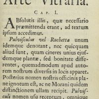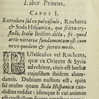 0036 - Page 1 - Liber primus. Caput I. Extrahere sal ex pulvisculo, Rochetta & soda hispanica, quo fritta crystalli, Italis bollito dicta, fit, quod artis vitrariae fundamentum est : cuns novo quodam & secreto modo