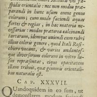 0104 - Page 69 - Liber II. Quo demonstratur versus modus faciendi calcedonium, colore achatis vel jaspidis orientalis : nec non modus praeparandi in hunc usum omne genus colorum ; cum modo faciendi aquas fortes & regias, in hac materia necessarias : modus praeterea calcinandi tartarum, idemque uniendi cum rubri illius coloris genere, quod Itali rosichiero vocant, & varios undantesque diversorum colorum in vitro lusus repraesentat, eique opacitatem illam tribuit, quae gemmis orientalibus naturalis est. Cap. XXXVII