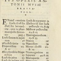 - Antonii Musae Brassavoli medici Ferrariensis Examen omnium loch, id est, linctuum, suffuf, id est pulverum, aquarum, decoctionum, oleorum, quorum apud Ferrarienses pharmacopólas usus est. His accessit de morbo Gallico lepidissimus ejusdem authoris tractatus. Ad Reverendiss. Balduinum de Balduinis, Episcopum Marianensem.