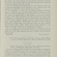 0061 - Page 43 - Revue bibliographique. I.Histoire de la médecine. France. Dr. P. Guigues, .... Najm ad-Dyn Mahmoud (P. Guigues) / Dr. C. Chauveau. Histoire des maladies du pharynx. Paris, Ballière et fils 1901 et 1902 (Voir: Revue des Périodiques pg. 46) / Italie. J. Arata. L’arte medica nelle iscrizioni latine ; contributo storico Romano. Genova, P. Pellas édit. 1902