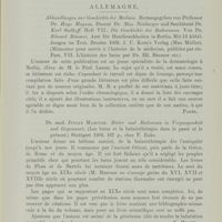 0054 - Page 36 - Revue bibliographique. I. Histoire de la médecine. Allemagne. Ernst Weber. Ueber die geschichtliche Entwicklung der anatomischen Kenntnisse von den weiblichen Geschlechtsorganen. Thèse, Wurzb., 1899 (P. Pansier) / Heinrich Berger. Aus dem Hamsterkasten. Verlag von Seits und Schauer, München 1902 (Hermann Peters) / Theodor Hampe. Die fahrenden Leute in der deutschen Vergangenheit. Verlegt bei Eugen Diederichs in Leipzig 1902 (Hermann Peters)