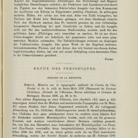 0040 - Page 28 - Revue bibliographique. I. Histoire de la medecine. Allemagne. Semmelweis'gesammelte Werke. Herausgegeben und zum Theil aus dem Ungarischen übersetzt von Dr. Tiberius von Györy, Privatdozent a. d. Universität zu Budapest. Mit Unterstützung der Ungarischen Akademie der Wissenschaften. Mit dem Portrait von Semmelweis und einer Abbildung seines Grabmals. Jena 1905. Gustav Fischer VII (Pagel) / II. Géographie médicale. Allemagne. H. Magnus. Die Volksmedizin, ihre geschichtliche Entwickelung und ihre Beziehungen zur Kultur. 1905. Magnus, Neuburger, Sudhoff, Abhandlungen zur Geschichte der Medizin. J. Kern (Μ. Müller) Breslau (Pergens)