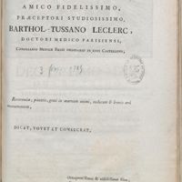 [Dédicace] Patri Optimo, Amico Fidelissimo, Praeceptori Studiosissimo, Barthol.-Tussano Leclerc, Doctori Medico Parisiensi, Consiliario Medico Regis ordinario in ejus Castelleto, Reverentiae, pietatis, grati in aeternum animi, caducum & brevis aevi monumentum, Dicat, Vovet Et Consecrat, Obsequentissimus & addictimus filius, Claudius-Bartholomaeus-Joannes Leclerc, Bacc. Med. Paris.