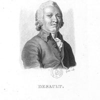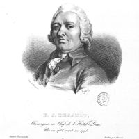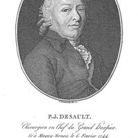 Chirurgien de l'Hôtel-Dieu de Paris et professeur de clinique externe à l'Ecole de Santé de Paris. Pierre Desault entreprend des études de chirurgie en province à l'Hôpital de Belfort, puis vient à Paris pour suivre les cours d'anatomie de Sabatier, d'A. Petit et de A. Louis. Il enseigne lui-même l'anatomie d'une manière plus pratique en ouvrant un cours privé et, grâce au soutien d'A. Petit et de Pichault de la Martinière, il devient membre de l'Académie de chirurgie. A partir de 1776, il pratique la chirurgie dans divers hôpitaux parisiens. Après les troubles révolutionnaires il est nommé professeur de clinique chirurgicale à l'Ecole de Santé en 1795. En juin 1795, il examine le dauphin emprisonné au Temple. Desault est à l'origine de l'étude de la maladie au lit du patient ; il forme ainsi un grand nombre de chirurgiens. Lorsque Bichat arrive à Paris, il le prend sous sa protection, le forme, et Bichat devient son fils spirituel. Ses oeuvres chirurgicales (cote : 30626) sont publiées par Bichat en 1798, ainsi que son Traité des maladies des voies urinaires (cote : 71711).