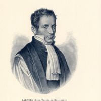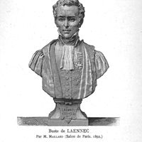 Médecin, créateur du diagnostic médical par auscultation. Fait ses premiers pas comme étudiant en médecine grâce à son oncle Guillaume, médecin à la Faculté de médecine de Nantes. Il y effectue de brillantes études qu'il poursuit à Paris à partir de 1801. Esprit génial et travailleur acharné. Entre 1816 et 1819, il découvre l'application anatomo-clinique de l'auscultation, invente le stéthoscope ou "cylindre". Publie en 1819 "De l'auscultation médiate ou traité du diagnostic des maladies des poumons et du coeur", ouvrage capital qui ouvre le chemin de la médecine moderne (cote : 165920). La seconde édition est publiée l'année de sa mort (cote : 31750 A). Dans cet ouvrage, Laënnec décrit le pneumothorax, fait la distinction entre les diverses maladies des bronches et la pleurésie. Il écrit "tout diagnostic doit être basé sur des signes physiques des maladies".
