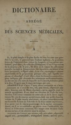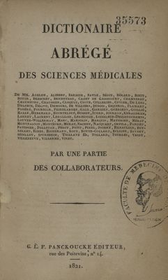 - Une société de médecins et de chirurgiens, Dictionnaire abrégé des sciences médicales. Paris : Panckoucke, 1820, Volume 1, A-ANU, 572 pages, 22 cm.