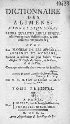 - Frontispice présent sur chaque volume – Dictionnaire des alimens, vins et liqueurs, leurs qualités, leurs effets , relativement aux differens âges, & aux différens tempéramens ; avec la maniere de les apprêter, ancienne et moderne, suivant la méthode des plus habiles chefs-d'office & chefs de cuisine, de la cour, & de la Ville. Ouvrage très-utile dans toutes les familles. Par M. C. D. Chef de cuisine de M. le prince de ***.