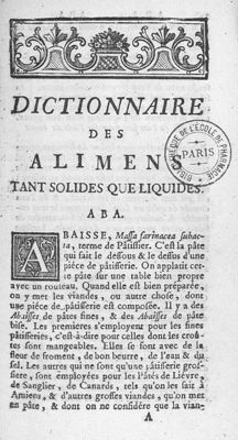 - [Briand], Dictionnaire des aliments, vins et liqueurs, leurs qualités, leurs effets... Paris : Gissey, Bordelet, 1750, première édition, Volume 1, ABA-ETU, 582 pages, in-12.