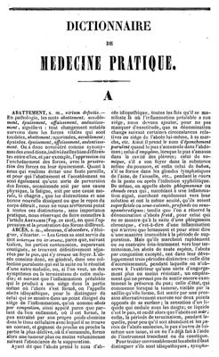 - Frontispice présent sur le volume – Dictionnaire de médecine-pratique et des sciences qui lui servent de fondements. Contenant, outre les articles obligés d’anatomie, de physiologie, d’hygiène, d’étiologie, de séméiologie, de pathologie, de thérapeutique, et de matière médicale, la définition des mots qui doivent en rendre le sens intelligible à tous les lteurs. Ouvrage destiné à MM. les ecclésiastiques, les chefs d'Institution, les membres des sociétés de bienfaisance, etc.