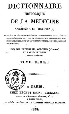 - Frontispice présent sur le premier volume – Dictionnaire historique de la médecine ancienne et moderne, ou Précis de l'histoire générale, technologique et littéraire de la médecine, suivi de la Bibliographie médicale du dix-neuvième siècle, et d'un Répertoire bibliographique par ordre de matières ; par MM. Dezeimeris, Ollivier (d’Angers) et Raige-Delorme, docteurs en médecine.