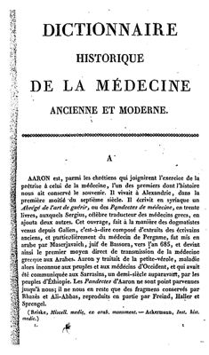 - Dezeimeris Jean-Eugène, Dictionnaire historique de la médecine ancienne et moderne…, Paris : Béchet jeune, 1828-1831, Volume 1, AAR-CYP, 934 pages, in-8.