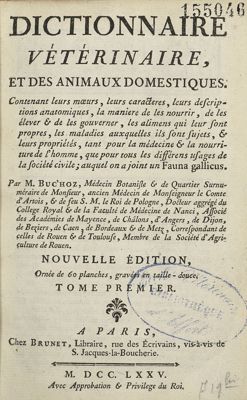 - Buc'hoz Pierre-Joseph, Dictionnaire vétérinaire, et des animaux domestiques..., Paris : Brunet, 1775, deuxième édition, Volume 6, VEN-VOL et suppléments, 688 pages, in-12.