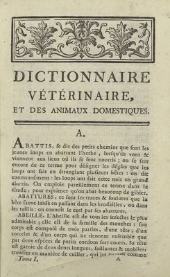- Frontispice présent sur chaque volume – Dictionnaire vétérinaire et des animaux domestiques. Contenant leurs mœurs, leurs caractères, leurs descriptions anatomiques, la manière de les nourrir, de les élever & de les gouverner, les alimens qui leur sont propres, les maladies auxquelles ils font sujets, & leurs propriétés, tant pour la médecine & la nourriture de l’homme, que pour tous les différens usages de la société civile; auquel on a joint un Fauna gallicus.