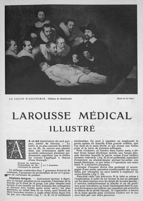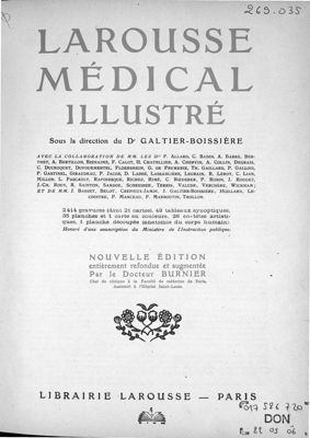 - Frontispice présent sur chaque volume – Larousse médical illustré, sous la dir. du Dr Galtier-Boissière. Avec la collaboration de MM. les Drs F. Allard, C. Badin, A. Barré, Berthet, A. Bertillon, Bienaimé, F. Calot, H. Chatellier, A. Chervin, A. Collin, Degrais, C. Ducroquet, Dufourmentel, Flœrsheim, G. de Frumerie, Th. Gaillard, P. Gallois, P. Gastinel, Giraudeau, P. Jacob, D. Labbé, Lassablière, Legrain, R. Leroy, C. Lian, Millon, L. Pascault, Rafinesque, Richez, Rimé, C. Rœderer, P. Robin, J. Rouget, J.-Ch. Roux, R. Sainton, Sandoz, Schreiber, Terris, Valude, Verchère, Wickham ; et de MM. J. Basset, Belot, Crépieux-Jamin, J. Galtier-Boissière, Huillard, Lecointre, P. Manceau, F. Marboutin, Thollon. / 2414 gravures (dont 21 cartes), 49 tableaux synoptiques, 35 planches et 1 carte en couleurs, 26 en-têtes artistiques, 1 planche découpée (anatomie du corps humain).