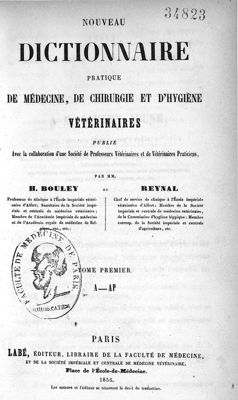- Bouley Henri-Marie, Reynal Jean, Nouveau dictionnaire pratique de médecine, de chirurgie et d'hygiène vétérinaires. Paris : Labé, 1856, Volume 1, ABA-APO, 716 pages, in-8.